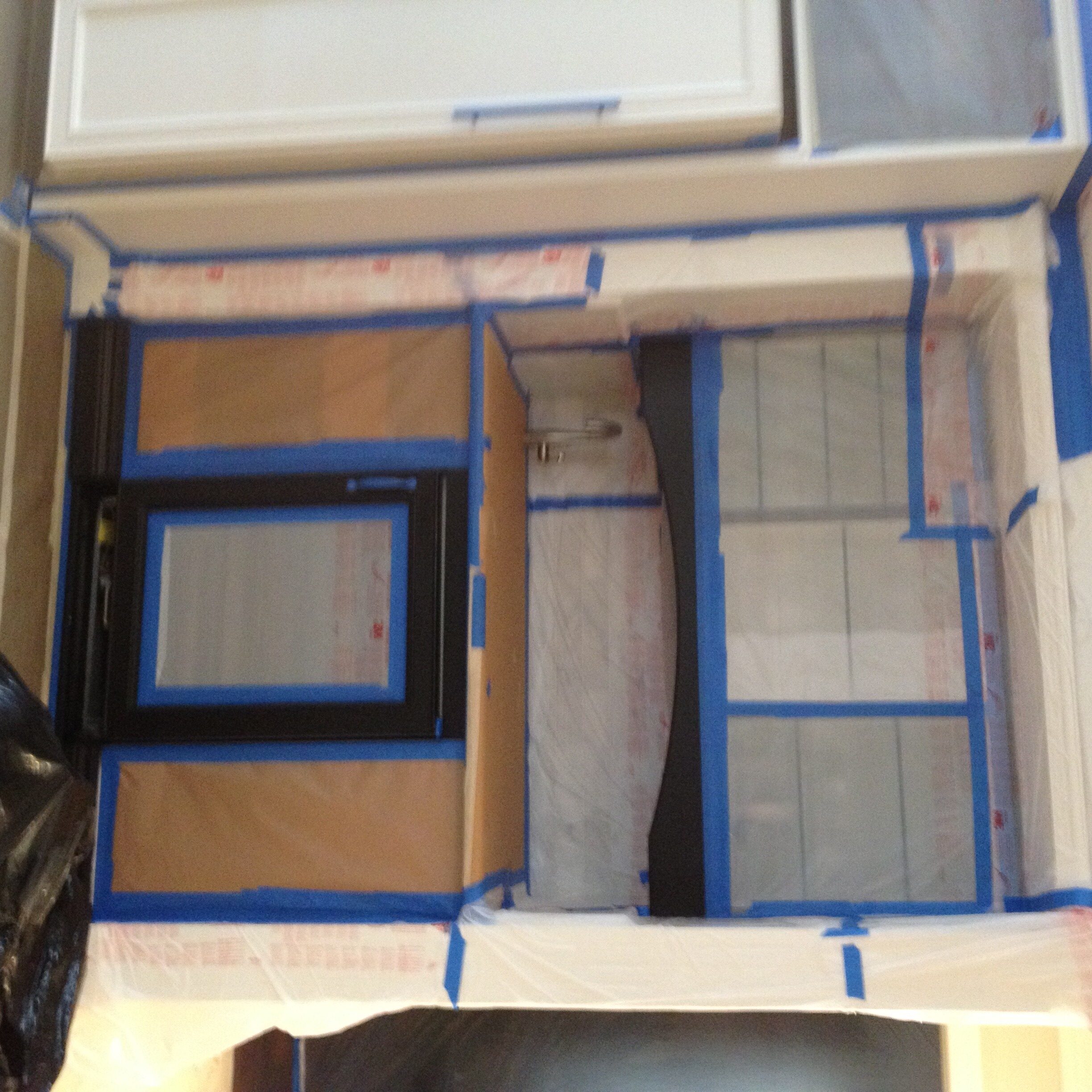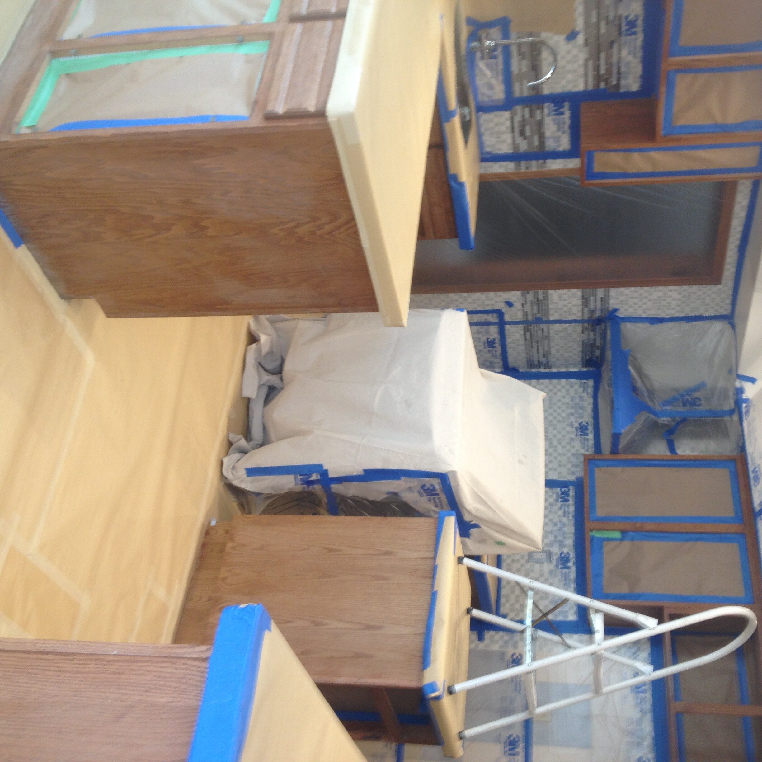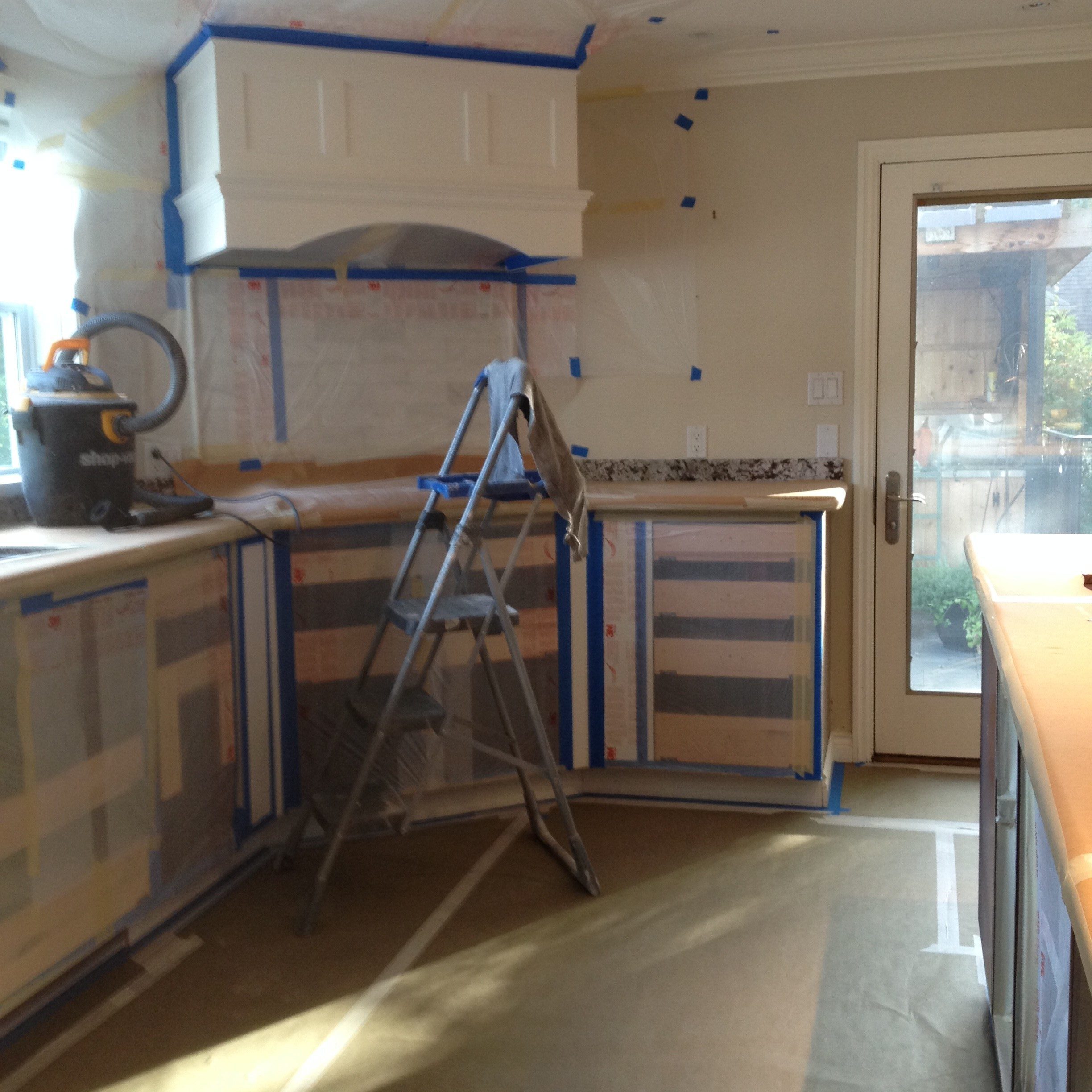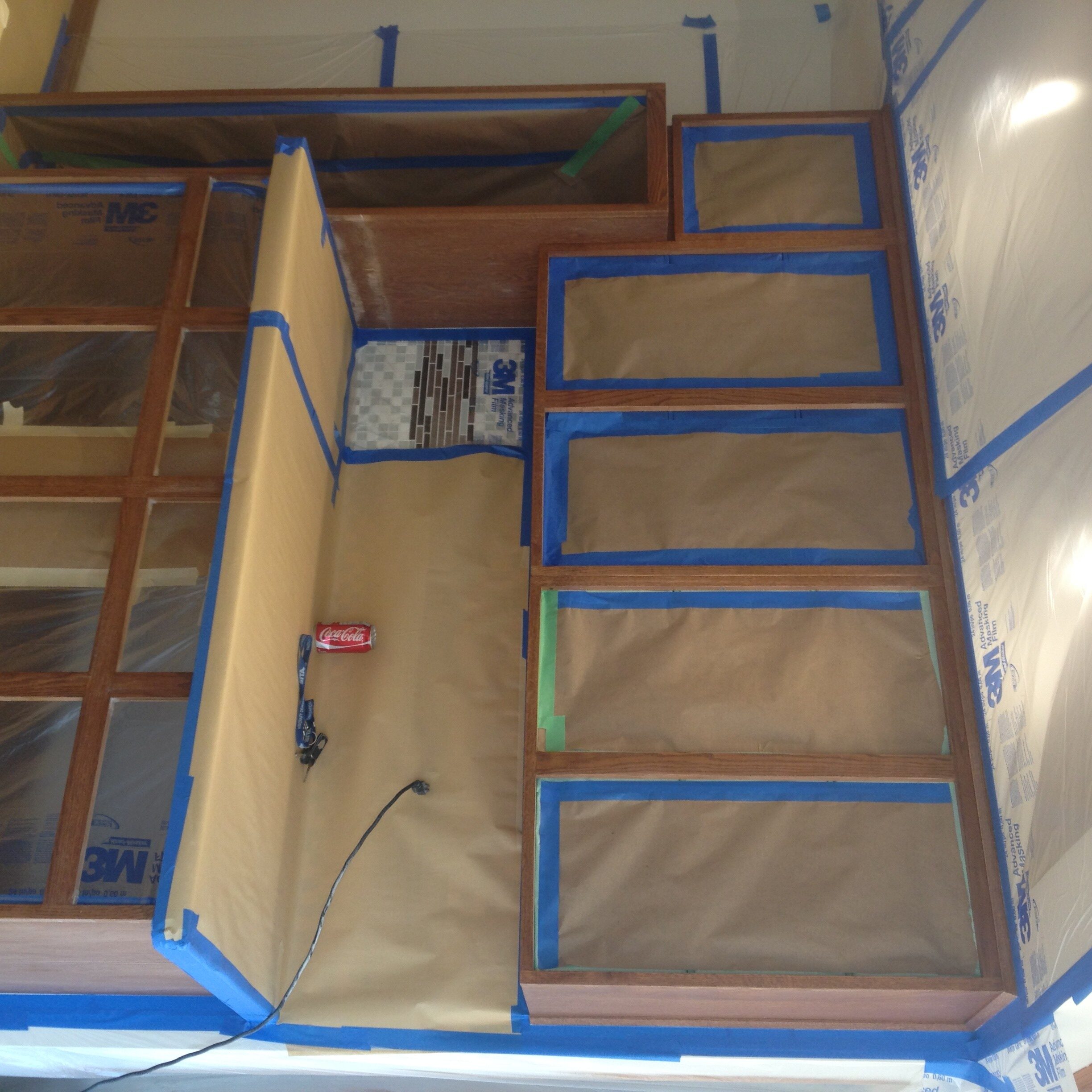 A) Take them off: Remove, label doors and all other hardware. See our blog post on Tips for Painting Kitchen Cabinets for more information about this.