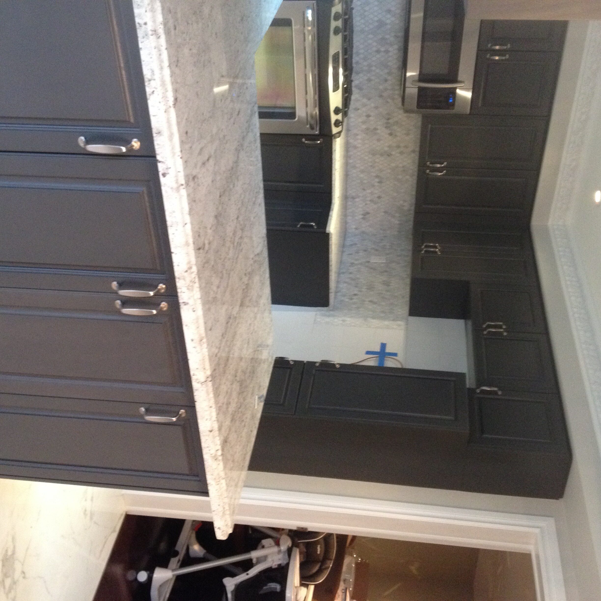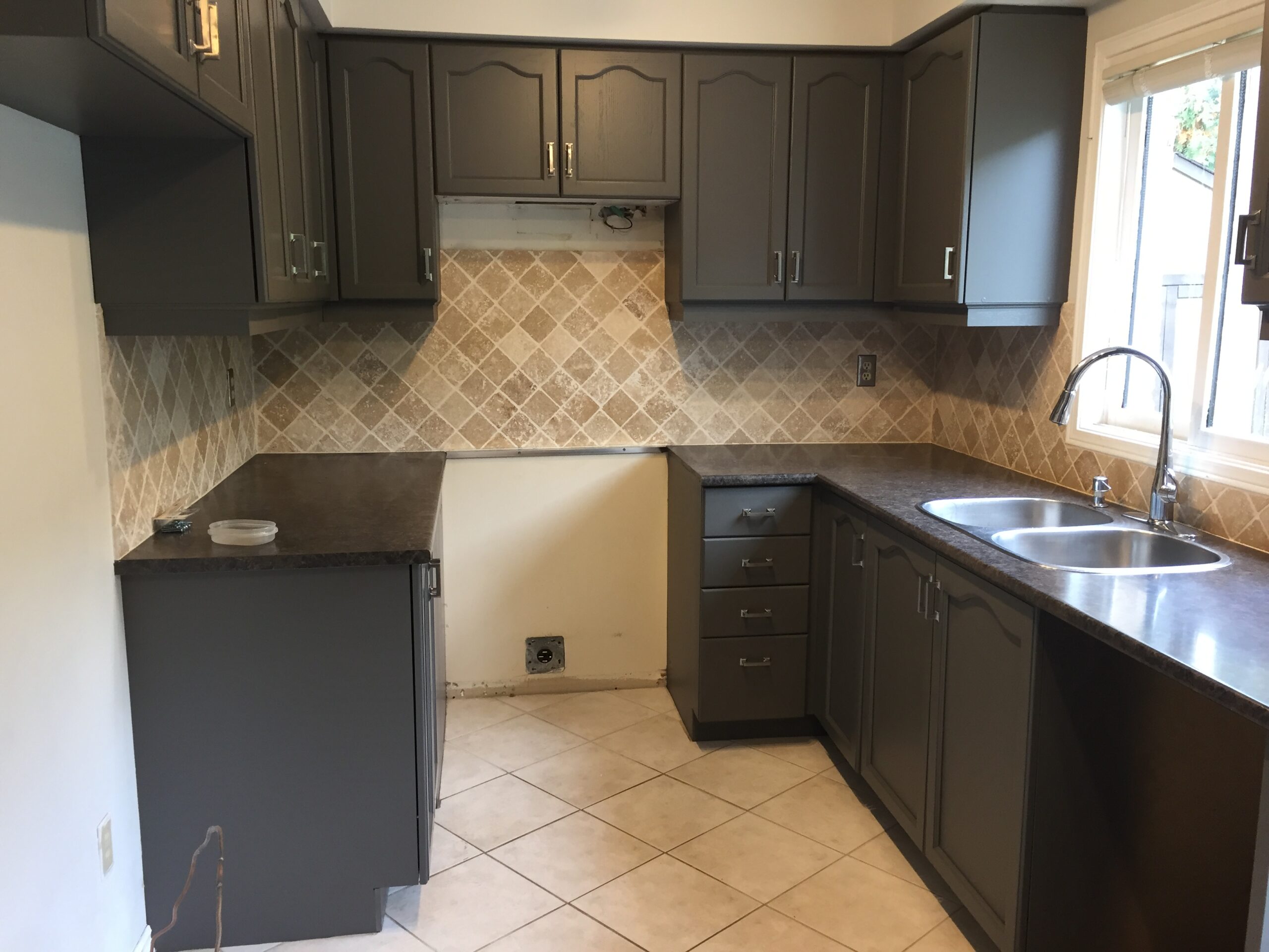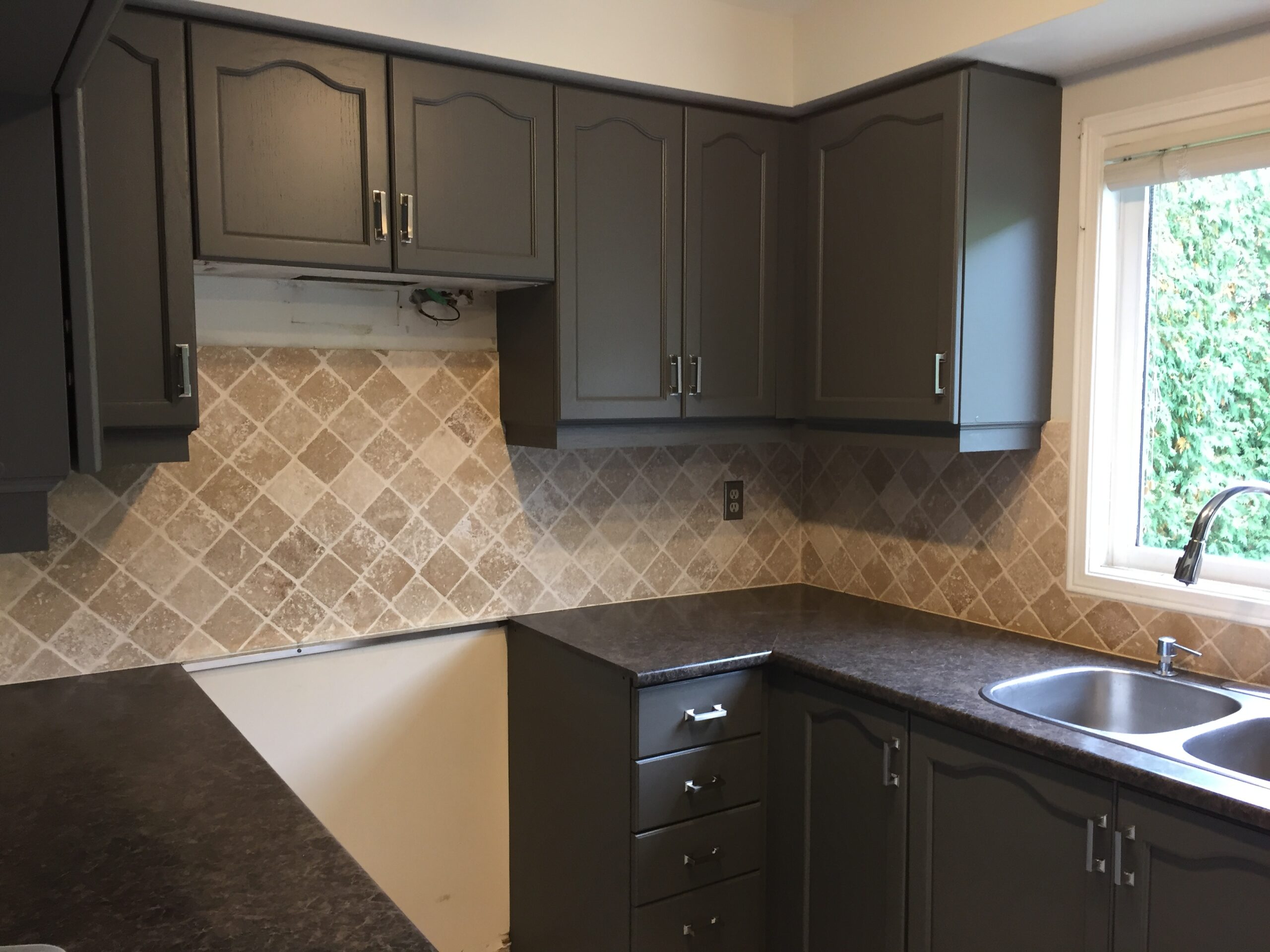 A) Take them off: Remove, label doors and all other hardware. See our blog post on Tips for Painting Kitchen Cabinets for more information about this.