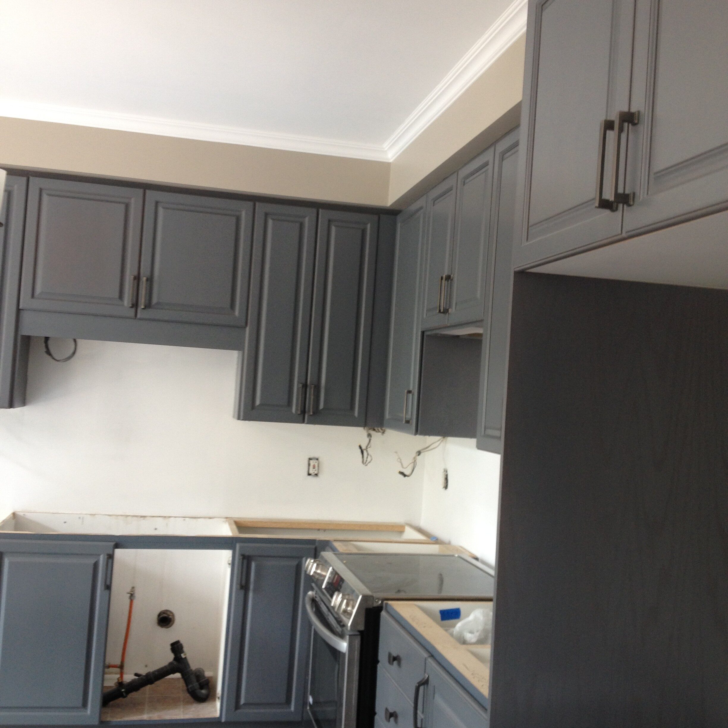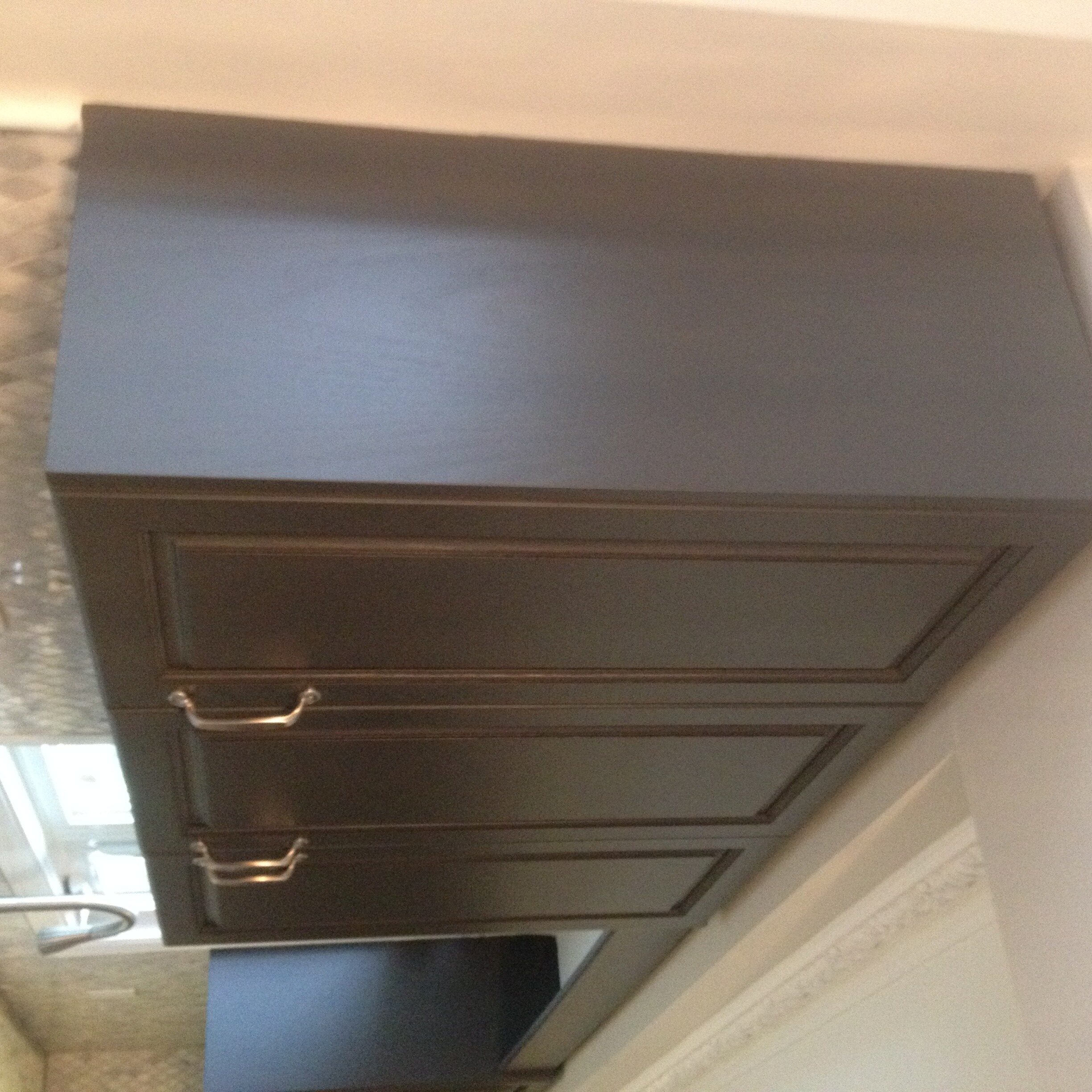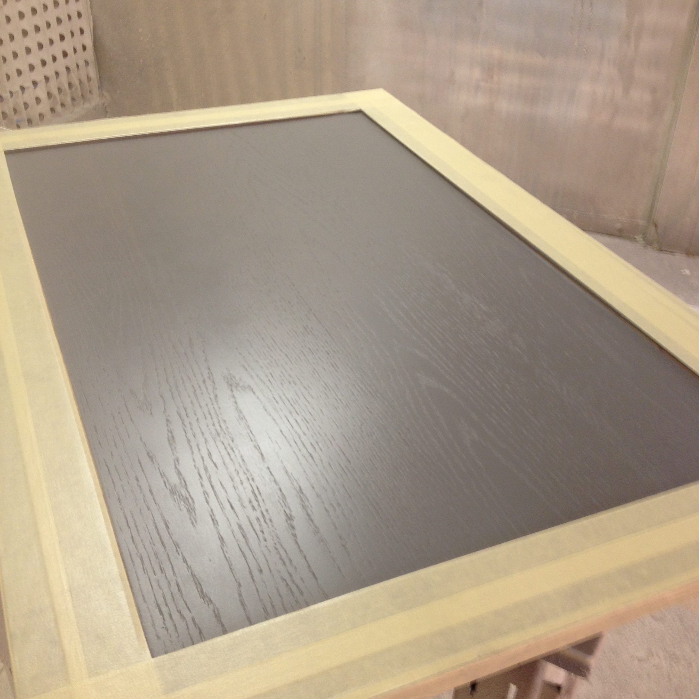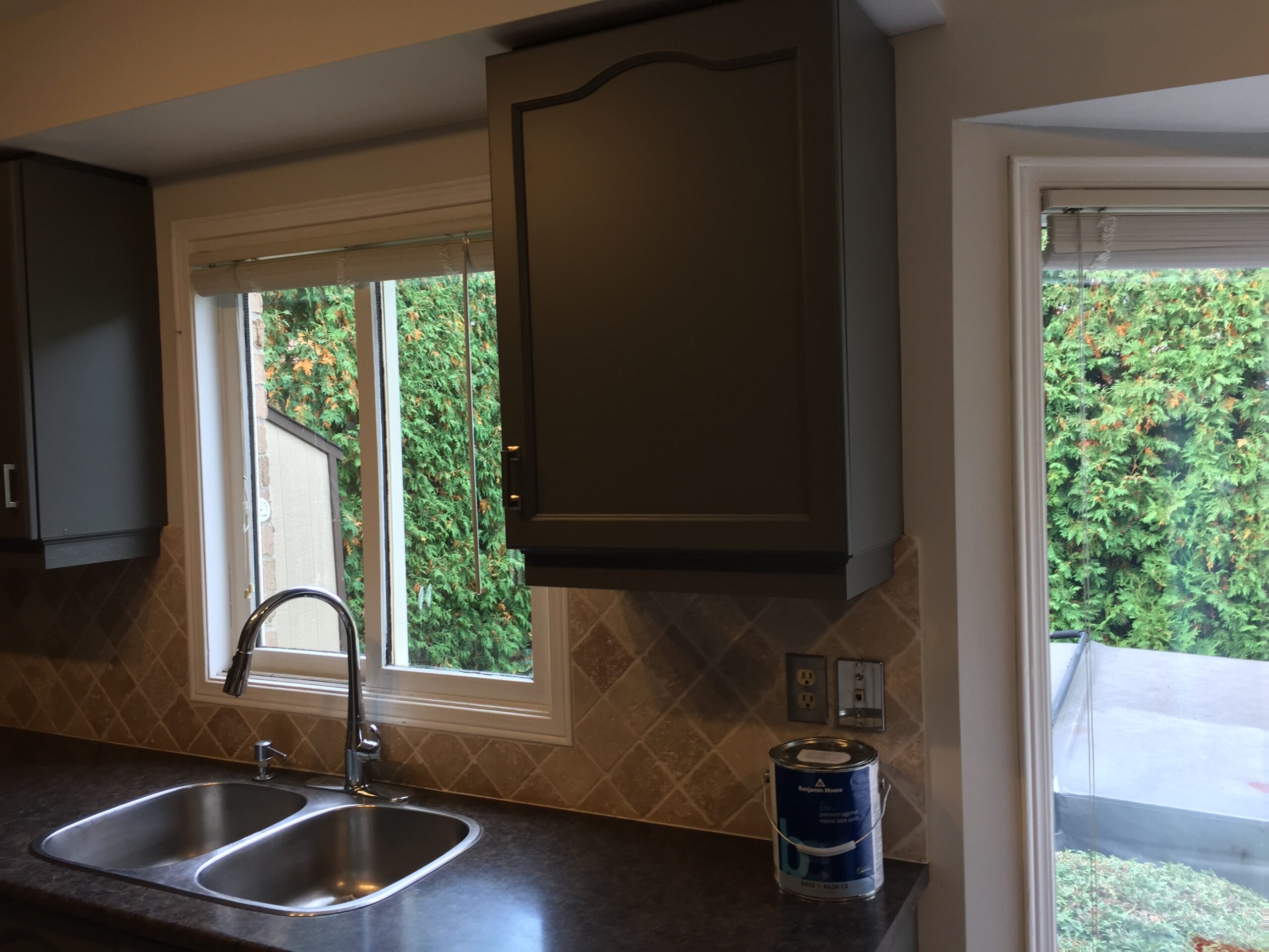 Oak is a very porous type of wood – the gain has deep crevices that cannot be penetrated by the light spray finish created by spray painting equipment – what happens is that spray usually dries prior to seeping down into the gain. On finishes done in white, lighter and mid-tone colours the grain can appear darker and pimple-like after the spray finish is applied. When the boards are painted darker colours (darker browns and greys) the effect is not so dramatic. It’s for these reasons we typically do not paint oak cabinetry a white, off-white, or mid-tone colour.