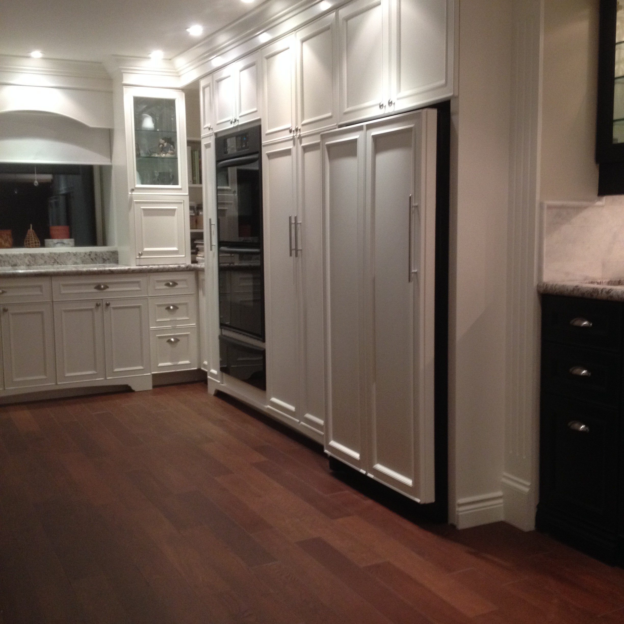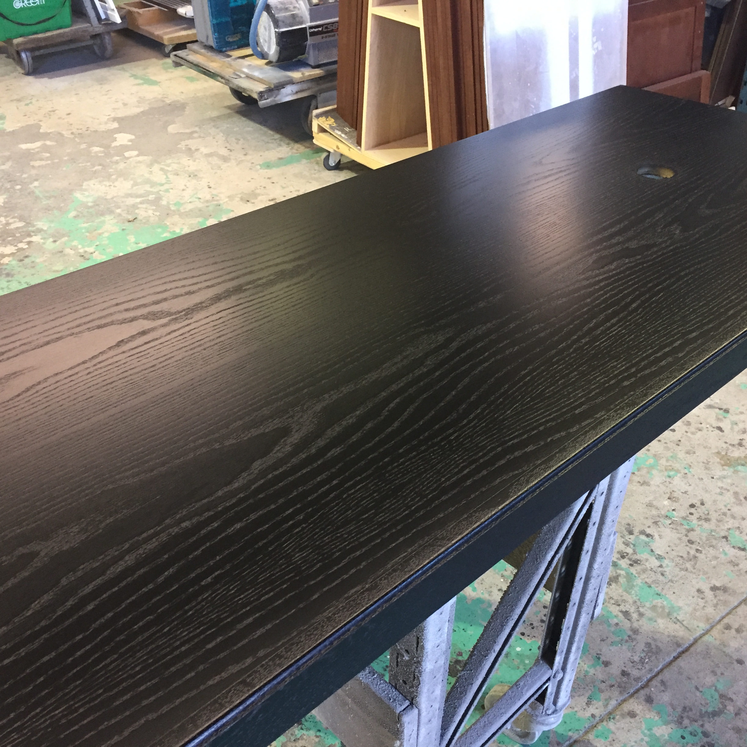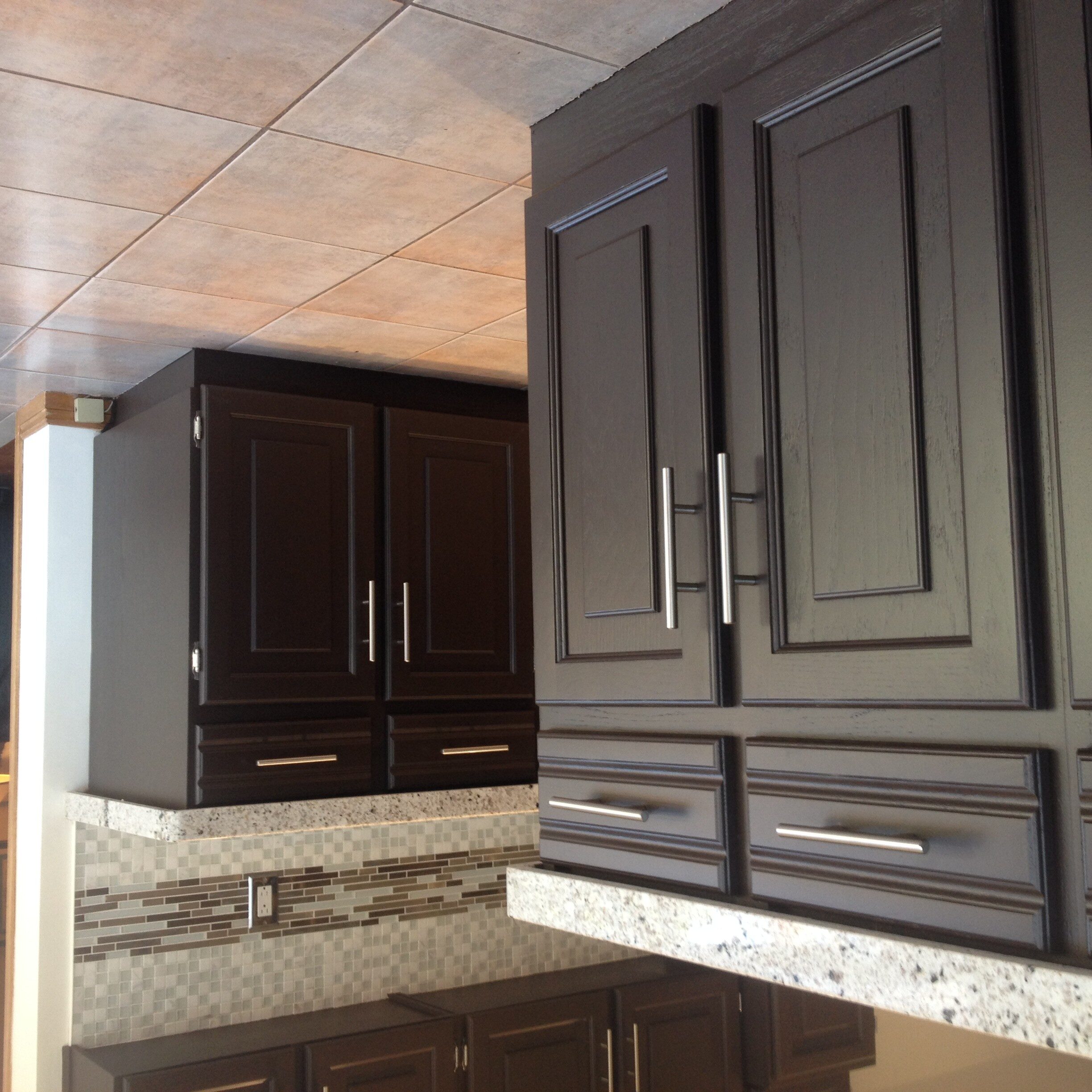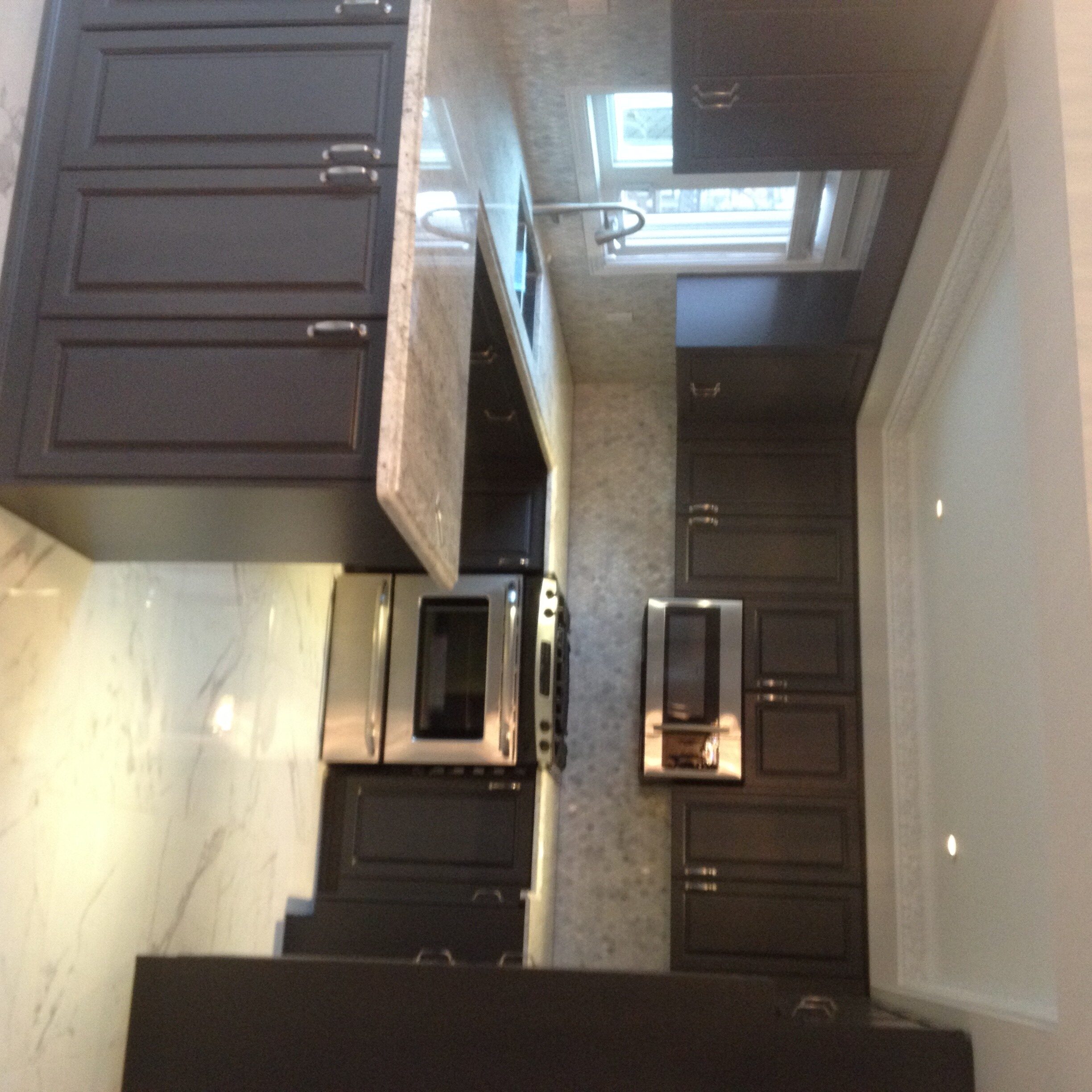 Oak is a very porous type of wood – the gain has deep crevices that cannot be penetrated by the light spray finish created by spray painting equipment – what happens is that spray usually dries prior to seeping down into the gain. On finishes done in white, lighter and mid-tone colours the grain can appear darker and pimple-like after the spray finish is applied. When the boards are painted darker colours (darker browns and greys) the effect is not so dramatic. It’s for these reasons we typically do not paint oak cabinetry a white, off-white, or mid-tone colour.